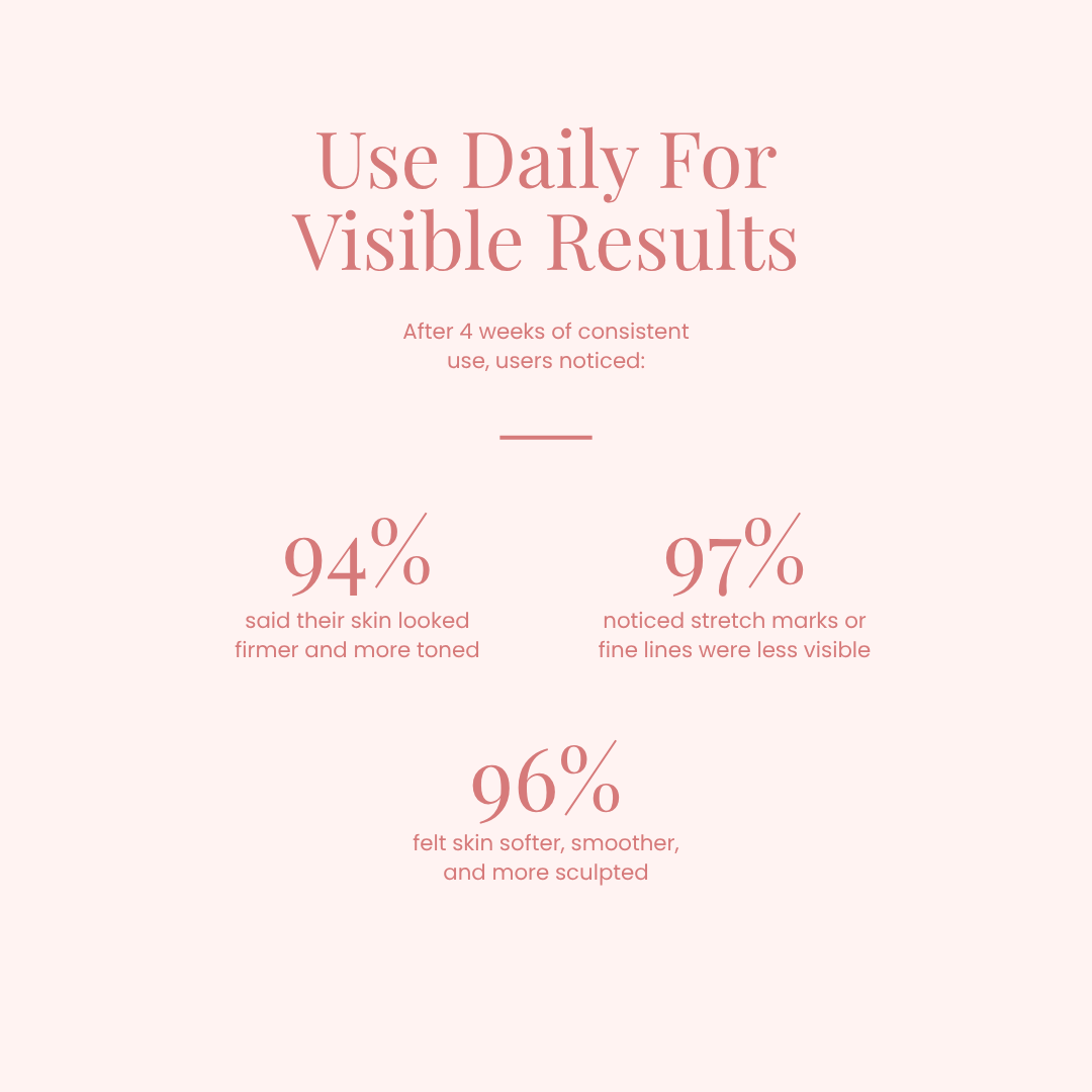 Many users notice smoother skin texture within 2–3 weeks. Stretch marks and firmness improvements take consistent use over several weeks.