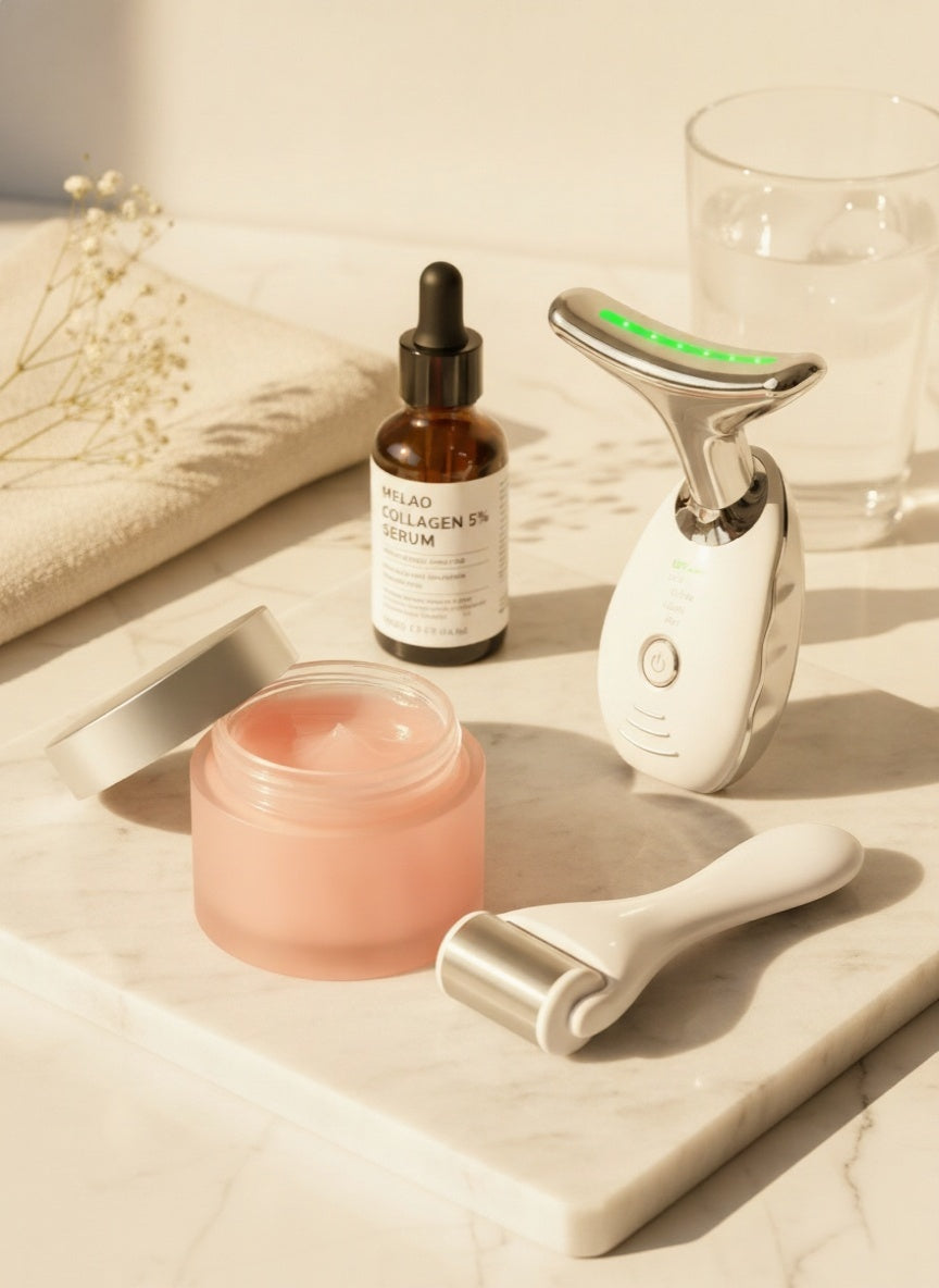 1️⃣ Red LED Light Therapy — a dermatologist-endorsed treatment proven to stimulate collagen, improve skin density, and reduce fine lines. The red light penetrates deep into the dermis, energizing cells and enhancing your natural radiance.