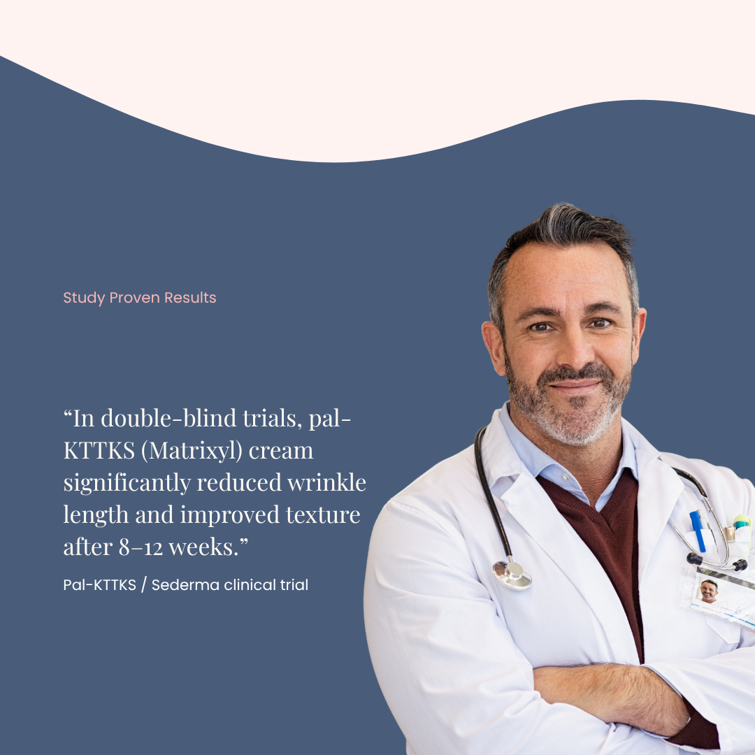Clinical peptide research shows palmitoyl pentapeptides (KTTKS derivatives) increase procollagen secretion and improve texture in human fibroblast models. Additionally, Matrixyl® 3000 has been shown in clinical trials to improve elasticity, reduce wrinkle volume, and support skin firmness.