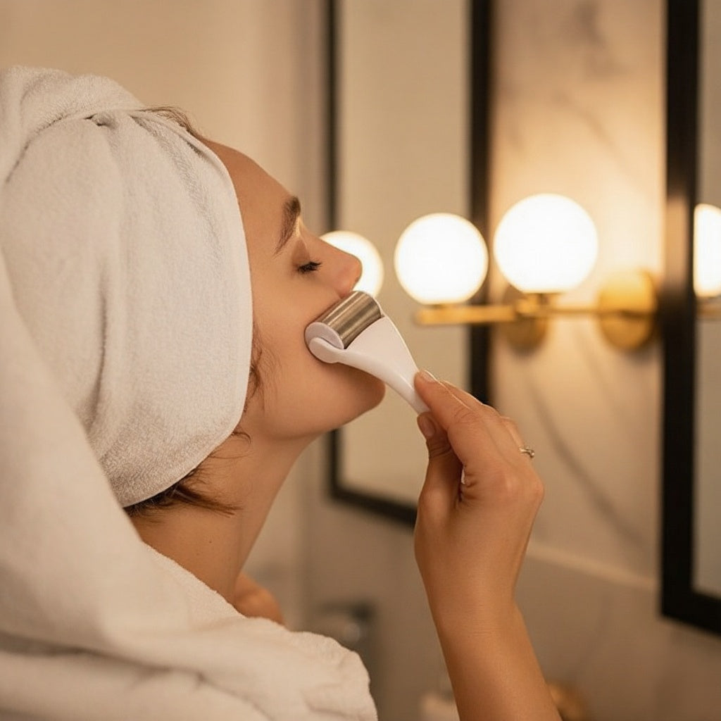 4️⃣ Roll & Sculpt – Gently glide the roller upward along your jawline, cheeks, and under-eye area for 2–5 minutes.